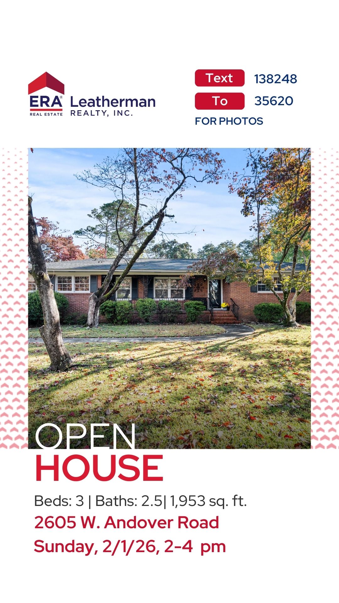 Fall in love with this charming, well-kept older home with a nostalgic feel in highly desirable Grove Park subdivision. Near Revell Park, situated on a 0.57 acre lot. This home is in a superb location convenient to everything! Served by West Florence Schools. 3 Bedrooms, 2.5 Baths, 1953 Sq. Ft. plus versatile office/bonus room. Combination formal living/dining room just off the foyer sets a welcoming tone. Hardwood floors flow throughout with carpeted bedrooms preserving the original wood beneath. The kitchen includes a cozy breakfast area with a convenient laundry room making everyday living easy. Cozy up in the den by the wood-burning fireplace or entertain on the back deck overlooking the private, shaded lot with mature landscaping. Already annexed into the city, the home features City Water, City Sewer and City Trash Pickup. Come by the open house on Sunday, 2/1/26, to check out this gem before it’s too late! Hosted by Jean Leatherman, ERA Leatherman Realty. 843-229-7420.